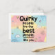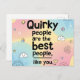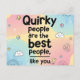 A lovely and uplifting design featuring the heartwarming quote, "Quirky people are the best people, like you." The text is set against a soft, blended background of pink, yellow, and blue pastel gradients, framed by delicate doodle elements like buttons, clouds, and butterflies. This aesthetic is perfect for positive encouragement, best friend gifts, self-love affirmations, and anyone who appreciates a clean, colorful, and wholesome design.