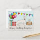 Ilustração original de Destei de um cão da raça Pastor Suíço Branco / Pastor Alemão branco. O cão está colocado num cenário colorido de aniversário. Há um bolo de aniversário com algumas velas, balões coloridos de aniversário e uma faixa de bandeirinhas, além de duas caixas de presente. Há também uma área de texto personalizável.