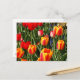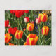 Um pedaço de tulipas na estrada. Há tulipas em diversas cores, incluindo vermelho, rosa e branco, amarelo, amarelo e laranja. Um pequeno trecho de acinto de uva pode ser visto espreitando entre os caules de tulipas.
