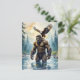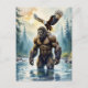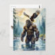 Cartão postal de pé-direito. Um Sasquatch muscular com uma águia pousando em seu ombro enquanto ele percorre um rio em uma floresta.