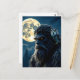 Cartão postal de pé-direito. Um Sasquatch com olhos brilhantes de ouro com uma coruja no ombro com um fundo de floresta de lua cheia em tons de azul.