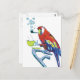 Um desenho mestiço de cor brilhante de um papagaio vermelho, azul e amarelo, soprando bolhas de sabão de um cachimbo fumante de brinquedo e bebendo uma xícara de chá china e um pires enquanto tocava na perna, parado em um galho.
