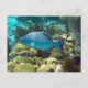 Nadando sobre os corais macios, as escamas de um peixe recife azul pegam algumas vernizes do sol, à medida que a luz se filtra acima da superfície da água, enquanto outros peixes menores natações no fundo.