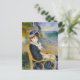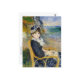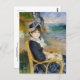 Um cartão postal com a pintura, By the Seashore (1883), do pintor francês Pierre-Auguste Renoir (1841-1919). Um retrato de uma jovem sentada em um vestido vitoriano azul e capota na praia no litoral. Renoir foi profundamente influenciado pela arte renascentista após uma viagem à Itália em 1881-82.
