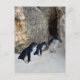 Imagem na praia é uma caverna de rocha onde três pinguins fizeram uma casa