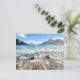 Linda fotografia de paisagem cartão postal de simpatia com montanhas, vista para o lago e sobreposição de arco-íris e uma citação cristã sincera de simpatia no verso da seguinte forma: "Deus se lembra de nós em nossa dor e Seu Amor fiel dura para sempre!"