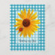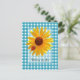 Um gingham azul giro pensando em você, um cartão postal com uma joaninha vermelha e bonita sentada sobre um girassol amarelo.