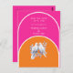 Arranjou dois conjuntos de convites coloridos para casamento, em rosa quente e tangerina. Esta opção para salvar a data card corresponde ao convite do mesmo design. Um par de pombas brancas segurando o conjunto de anéis de casamento completa esta design. Também vem em outros conjuntos de cores.