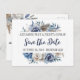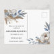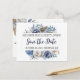 Este lindo cartão postal Save the Date é o primeiro que os seus convidados de casamento verão do seu casamento que está por vir. Este design de rosas, peônias e pampas em aquarela em azul e marfim cria uma declaração elegante para os seus futuros convidados de casamento.