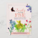 Convite de aniversário com uma pequena fada de leão e flores silvestres coloridas. Uma feliz colagem de pinturas aquáticas pintadas à mão para a pequena que comemora seu quinto aniversário.