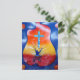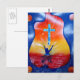 A figura azul ascensão para fora de um mar vermelho mantém os braços até uma cruz azul clara e branca contra um céu vermelho, laranja e amarelo. Toda cena composta dentro de um contorno de guitarra acústica, cena espacial com planetas e estrelas ao redor