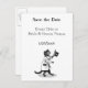Um cartão postal personalizado de Save the Date com letras vintage e um desenho de caneta e tinta preto e branco de um gato usando óculos e um casaco, inclinando seu chapéu alto. Clique em Personalizar para alterar as fontes, dimensionamento, enviar sua própria foto e mais, até mesmo salvar seu design para mais tarde.