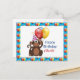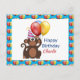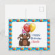 Personalize este cartão postal de aniversário com o nome do seu filho. Este cartão postal apresenta um macaco de festa com balões