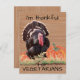 Um simples cartão postal rústico de Ação de Graças para qualquer vegetariano ou vegano, para dar ou receber. "Sou grato pelos vegetarianos" emoldura uma bela foto de peru! O peru é acentuado com aquarela de gramíneas sazonais de outono, samambaias e abóboras laranja, sobre um fundo de bambu natural. O verso tem uma imagem menor do peru sobre o fundo de bambu bege/marrom e informações sobre o artista. O peru apresentado é "Goondah", um animal de estimação da família. Arte caprichosa, única e original, fotos e design de Tuzi Williams.