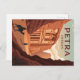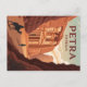 Ilustre uma poster viagens vintage para Petra, Jordan. Concentre-se no famoso Al-Khazneh (Tesouro) esculpido nos penhascos de rocha rosa-vermelha. Enquadre-o com um caminho estreito (Siq) com um camelo e um viajante entrando na cena. Use terracota quente, laranja e tons de areia com texturas estilizadas de rocha. Enfatize sombras e luz para dramatizar a arquitetura antiga. Incorporar a fonte serif do mundo antigo para o nome do país."