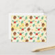 Um cartão-postal com um padrão fofo, com cones de pínus e holly sobre fundo de aquarela amarela com pequenos círculos brancos espalhados por aí.