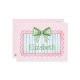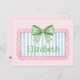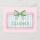 This cute postcard features a pink frame with blue and white stripes and topped with a preppy green and white gingham plaid bow on a background of pink and white polka dots. Personalize with your choice of name or special text on the front. Fun for personalized party favors and gift bags.
