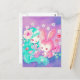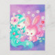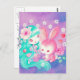 Garota bonita de chibi com cabelo turquesa fluente, adoravelmente acariciando seu coelho rosa de estimação.