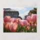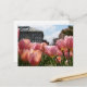 Bug's-eye view of pink tulips with a slight yellow base. The North End of Boston in the background.