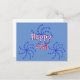Os fogos de artifício oferecem uma saudação "Happy 4th!". Rodinhas de estrelas azuis brilhantes rodeiam o texto que aparece em vermelho e branco com sombreamento. O fundo é azul médio.