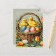 Pintinhos de Páscoas bonitas e antiquadas estão sentados em uma cesta cheia de ovo com tulipas vibrantes ao redor. Personalize o outro lado deste cartão postal com os detalhes do seu partido.
