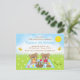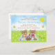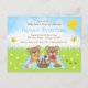 Este convite de aniversário fofo e caprichoso apresenta ursos adoráveis fazendo um piquenique em uma toalha xadrez azul com guloseimas como mel, melancia, geleia de morango, limonada e torta. Ao fundo, um céu azul brilhante e sol, borboletas e margaridas. O texto combina fontes decorativas e serifadas para um visual elegante e moderno. Isso é perfeito para uma festa de aniversário de primavera ou verão.