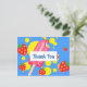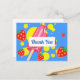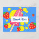 Um cartão de agradecimento de festa com tema de verão. Projetado com um pirulito rosa e alguns morangos vermelhos e respingos de tinta amarela. Fundo azul.