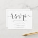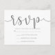 Essas placas RSVP de casamento simples e mínimas apresentam caligrafia azul em um white paper.