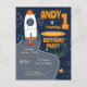 Convite de aniversário de Espaço Exterior | Foguetes, planetas e estrelas | Idade editável. Inicie a celebração do seu pequeno astronauta com este Convite de aniversário do Espaço Exterior com foguetes coloridos, planetas e estrelas cintilantes. Perfeito para rapazes, raparigas e todos os exploradores espaciais! Totalmente editável com o nome, a idade, os detalhes da festa e as informações de RSVP. Excelente para o primeiro aniversário ou qualquer marco. Combine com suprimentos de grupos coordenadores da nossa coleção de Aniversários de criança do Espaço Exterior!