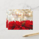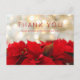 Um cartão postal de agradecimento de Natal com uma fotografia festiva de férias com um buquê de poinsétias vermelhas ao longo da parte inferior. Luzes de bokeh dourado brilhantes ao fundo. Mensagem personalizada no verso.
