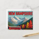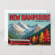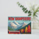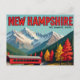 Um cartão postal colorido, estilo vintage, mostrando a icônica ponte vermelha coberta de New Hampshire, aninhada em uma folhagem de outono vibrante e colocada contra as majestosas Montanhas Brancas — celebrando a beleza natural do estado de Granite.