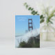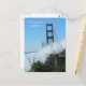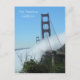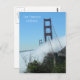 Voo treme sobre o convés da ponte Ouro Gate do Oceano Pacífico. A vista é do extremo norte, olhando para o sul. Texto no canto superior esquerdo: São Francisco, Califórnia está em branco contra o céu azul.