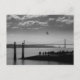 Fotografia preto e branco clássica de uma ponte de suspensão que estica para fora sobre um rio calmo cintilando.