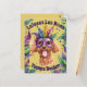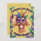 Um poodle com uma máscara na cabeça nas cores do festival Mardi Gras, verde, amarelo e roxo é uma escolha excelente se você quer um amante de cachorro, um poodle para enviar um cartão durante o feriado do Mardi Gras. Este cartão está repleto de arranjos florais nas cores do festival e lê Laissez Les Bons Temps Rouler, que significa Let the deus times roll.
