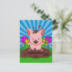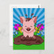 Porco rosa bonito brincando alegremente numa piscina de lama marrom. Atrás dele estão algumas flores coloridas, grama verde e um céu azul de explosão solar.