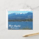 Cartaz viagem com uma vista fotográfica cêntrica da Olimpiadas norte da Península costeira de Port Angeles, Washington, juntamente com as montanhas de Olimpiadas cobertas de neve. Selecione entre um cartão de estilo mate ou brilhante.