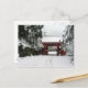 Cartão postal com fotografia de um portão de templo vermelho em queda de neve. Tirada no Templo Honkokuji em Quioto, Japão.