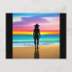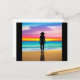 Silhueta de homem com cabelo encaracolado usando um chapéu, de pé em uma praia virada para o oceano ao pôr do sol, o céu é uma mistura de azul, rosa e laranja, o oceano é turquesa, a areia é dourada, a imagem é uma pintura digital com textura suave.