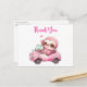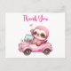 Cartão postal de agradecimento com uma ilustração caprichosa. Uma preguiça rosa dirigindo um conversível rosa. Adorável.