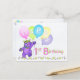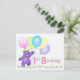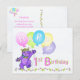Uma princesa de ursos roxos vestida com uma adorável coroa amarela e flores rosa, azuis e verdes está dançando através das flores e segurando um punhado de balões coloridos com a palavra FELIZ nelas. Este feliz cartão de aniversário trará um sorriso a uma garota especial no primeiro aniversario. Personalize com o nome dela para torná-lo especial. Design original do Anura Design Studio.