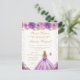 Este convite de aniversário de dezesseis anos elegante e glamoroso apresenta uma bela princesa com cabelo loiro e pele clara em um vestido de baile roxo. O texto combina caligrafia manuscrita e fontes modernas sem serifa para um visual sofisticado e clássico. Os arranjos florais, borboletas e confetes dourados criam a combinação perfeita de rústico e chique.