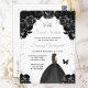 Este convite de aniversário de dezesseis anos doce e elegante apresenta uma bela princesa com cabelos castanhos em um vestido de baile preto. O texto combina caligrafia manuscrita e fontes modernas sem serifa para um visual sofisticado e elegante. As arranjos florais, borboleta e confetes prateados criam a combinação perfeita de rústico e chique.