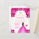Este convite de aniversário de sweet sixteen elegante e glamoroso apresenta uma bela princesa de pele escura em um vestido de baile rosa quente. O texto combina caligrafia manuscrita e fontes modernas sem serifa para um visual sofisticado e elegante. Os arranjos florais, borboleta e confetes dourados criam a combinação perfeita de rústico e chique.