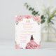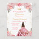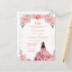Este convite de aniversário de Quinceañera elegante e glamoroso apresenta uma bela princesa com cabelos escuros em um vestido de baile rosa. O texto combina caligrafia manuscrita e fontes modernas sem serifa para um visual sofisticado e elegante. Os arranjos florais e confetes dourados criam a combinação perfeita de rústico e chique.