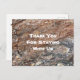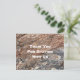 Este cartão postal promocional de natureza rústica apresenta uma bela foto da casca preta e marrom de uma árvore. Este tronco de árvore exibe sulcos profundos e linhas diagonais criando um padrão ao ar livre que captura a beleza da natureza. Suas palavras de agradecimento para seus hóspedes estão destacadas em fonte branca na frente e fonte marrom no verso, juntamente com seu nome ou o nome da casa. Personalize rapidamente todo o texto para um cartão postal barato que fará com que seus hóspedes aguardem ansiosamente o retorno.