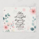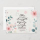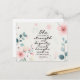 Cartão postal de citação inspiracional retrata um belo design floral com flores cor-de-rosa e folhas azuis. Apresenta a Bíblia Verse Proverbs 31:25, "Ela está vestida com força e dignidade e ri sem medo do futuro."
