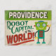 Um cartão postal engraçado da viagens vintage Providence Rhode Island com um robô amigável com um texto divertido e retrô que diz, "Providência, Capital Robô do Mundo!"