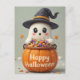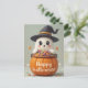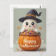 Envie fantasticamente a bondade com este cartão de Halloween, com um fantasma a saltar de uma abóbora, completo com um pequeno chapéu de bruxa. Doce e assustador diversão!