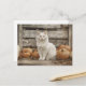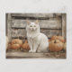 Uma pintura encantadora e inspirada em vintage, com um gato branco gracioso sentado entre as abóboras do outono, na região rustica. A cena é banhada em matizes quentes e ouros, evocando a aconchegante essência do outono. A pele macia do gato contrasta lindamente com as abóboras texturizadas, folhas caídas e elementos de madeira intacta no fundo. Uma peça perfeita para decoração de outono, charme de fazenda, ou amantes de gatos que apreciam estética de vintage.