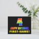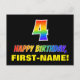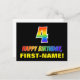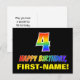 A frente deste design de cartão postal colorido, divertido e animado, com tema de aniversário, apresenta um grande número "4" e a mensagem "FELIZ BIRTHDAY", ambos tendo um gradiente de padrão inspirado no espectro do arco-íris, juntamente com um nome ousado de destinatário personalizado amarelo. A frente também apresenta um simples fundo preto. A parte de trás do cartão postal tem uma mensagem de saudação de aniversário personalizável, ou talvez pudesse ser apagada e deixada a vazio se uma mensagem fosse escrita manualmente. Um cartão postal de aniversário colorido e personalizável como este pode ser uma forma divertida de celebrar o quarto aniversário de alguém. [~Z0000474]